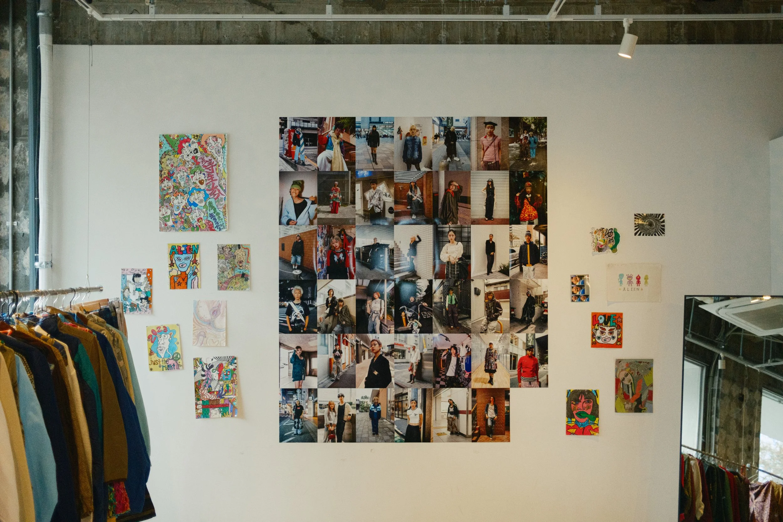 会場には主催者や出店者による個性豊かな洋服や小物が並び、壁一面にはFukuoka Fashion Snapで撮影したスナップ写真と、@染五郎様による作品が展示されました。